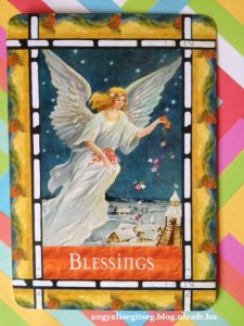 Blessings – áldás. Augusztus közepén már kaptuk ezt a kártyalapot, és most ismét azt üzenik az angyalok, hogy égi áldás kíséri a mai napot. Ma mindenben kérd bizalommal az angyalok és Isten segítségét, és egész nap tartasd észben, hogy az ég veled van! Hallgass a szeretetteljes égi inspirációra, és halld meg angyalaid üzenetit, mert ezek mindig a jó irányba terelnek. Tedd félre a negatív gondolatokat, a félelmeket, a sértettséget és a fájdalmakat, engedd meg magadnak, hogy ma valóban áldott napod legyen!